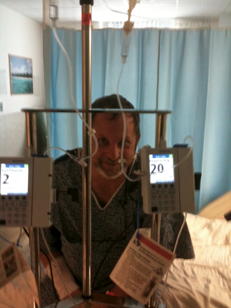 At 10:00 that night I was finally allowed to get up. It felt great! I spent 45 minutes just standing around — me & my pole of meds and monitors. My bypass was scheduled for 6:30 sharp the next morning and while I wasn’t scared, I was a bit nervous about the whole process. Which began at 11:00 PM.