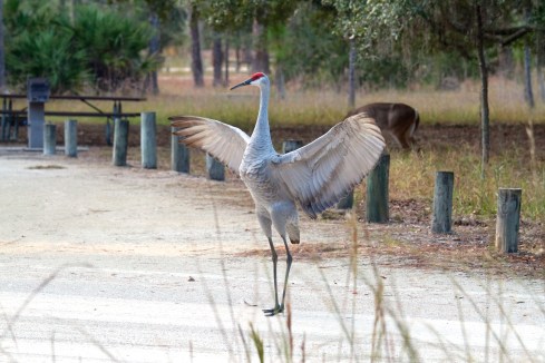 One of the things we like about this place are the critters that stroll through at all hours of the day. Deer, racoons, armadillos, Fox Squirrels and turtles have all made appearances. The most common critter in the campground is a protected bird: the Sand Hill Crane. They are tall, noisy birds that stroll around their habitat like they own the place which, in a sense, they do. They are protected in Florida and it’s common to see road signs warning of their presence and to find traffic stopped, even on major roads, while they stroll across the street. They are everywhere at Moss Park and we have had many experiences with them. (They also serve the function of an alarm clock, honking to each other VERY LOUDLY at dawn.) This trip I put on one of my better lenses and got some very nice shots.