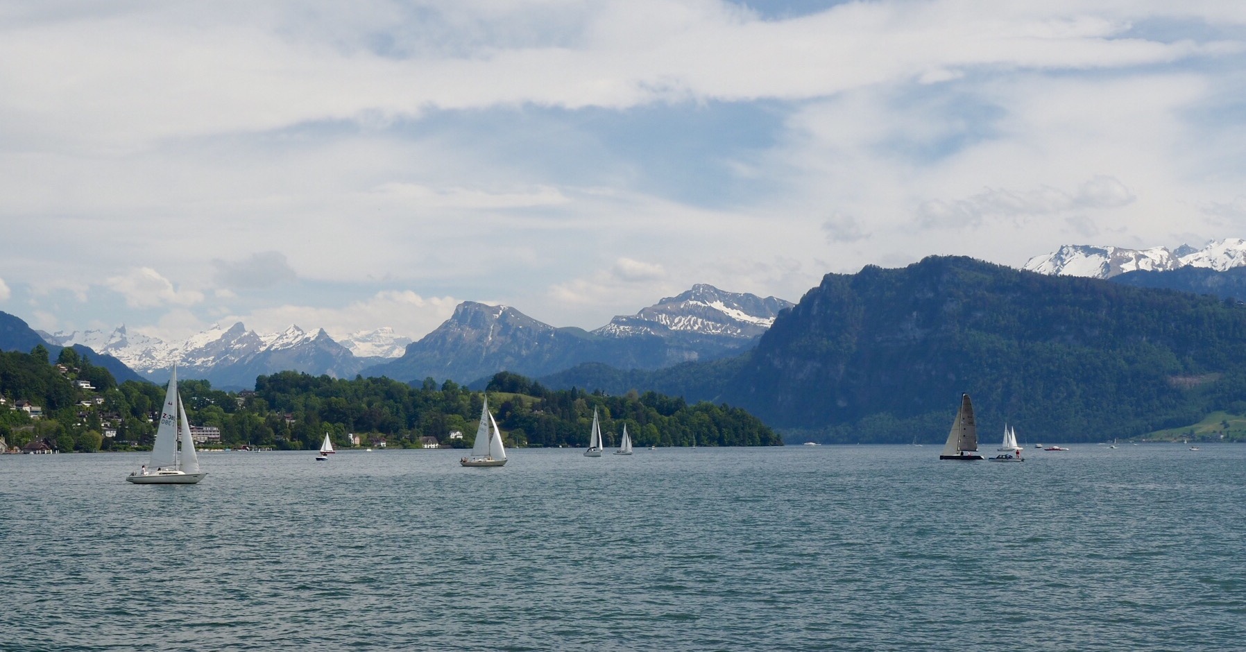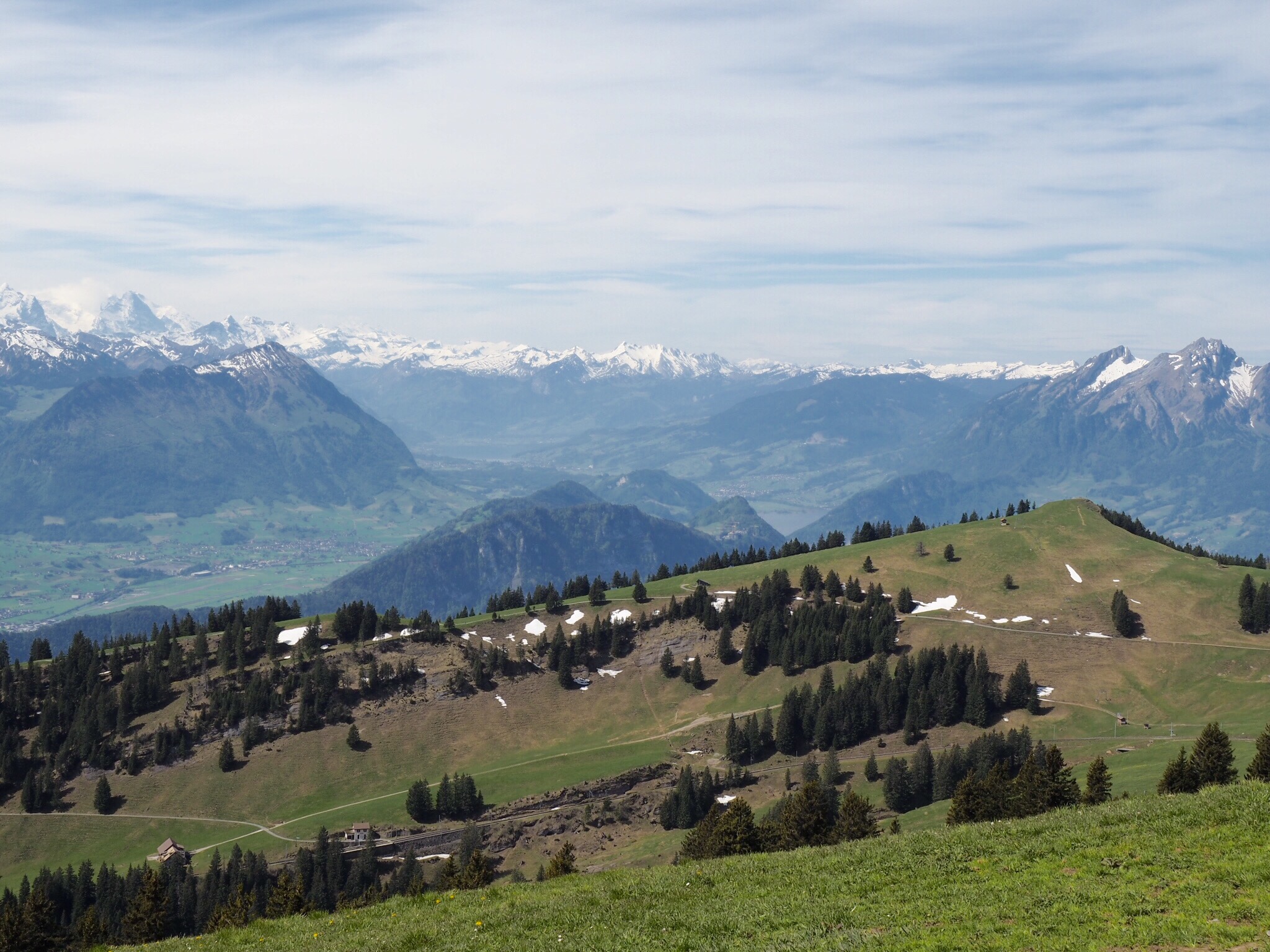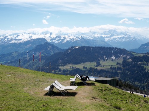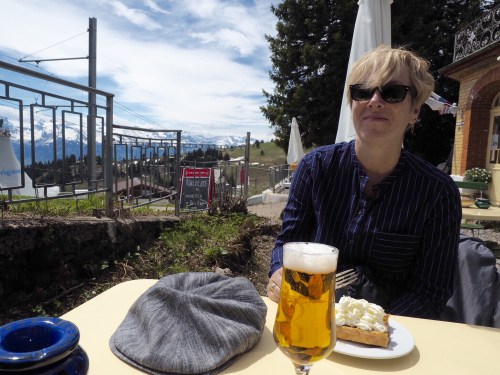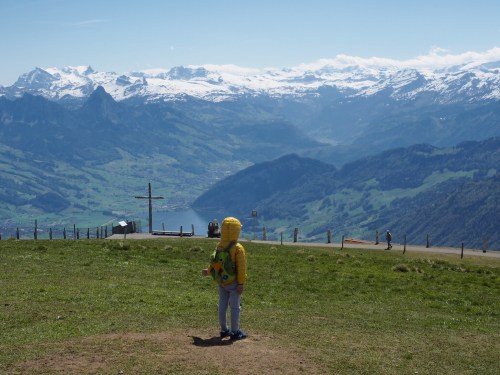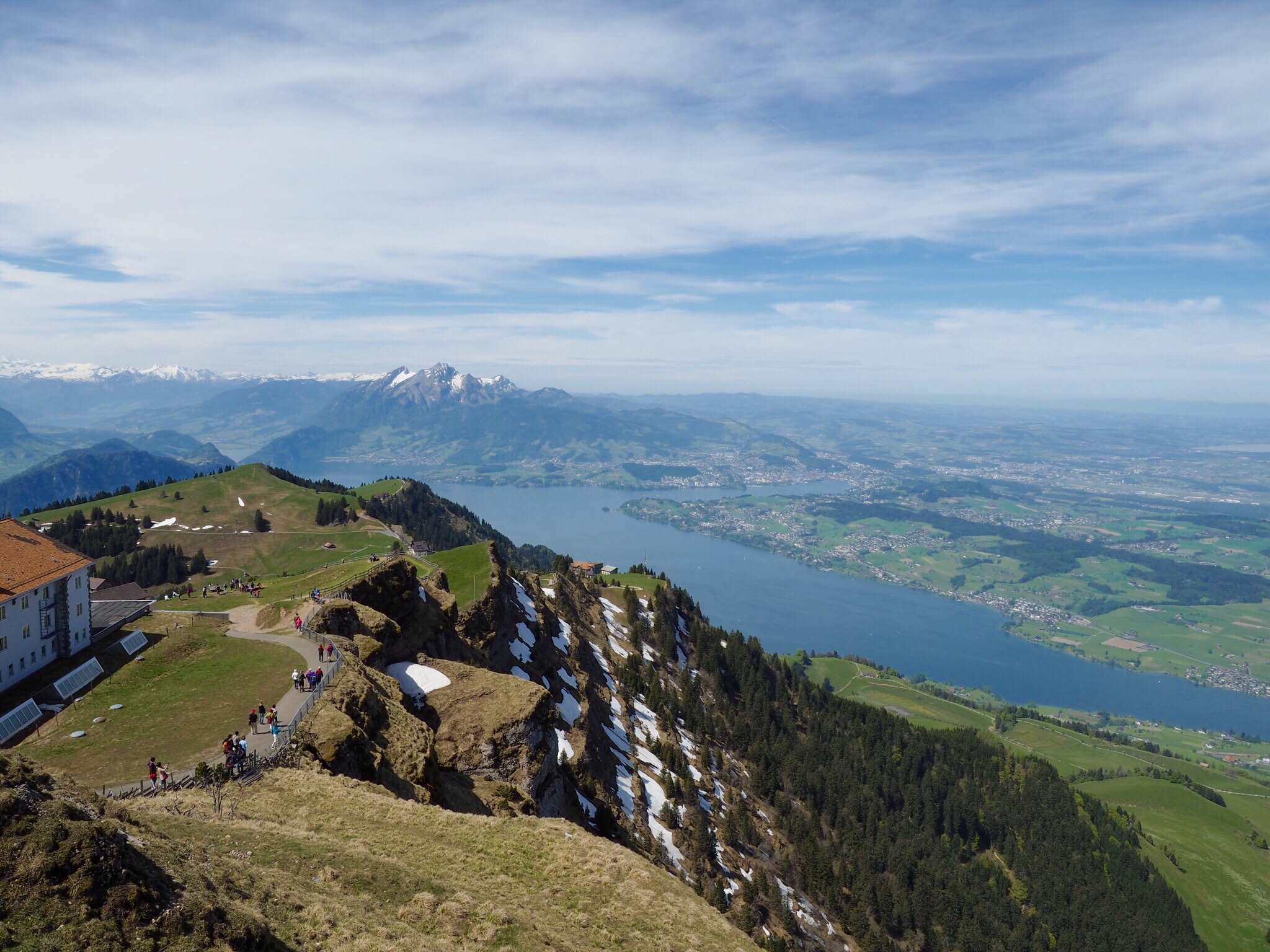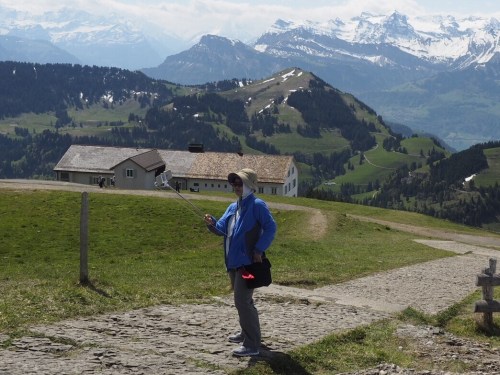 Today was our first full day in Switzerland and, despite all of the forecasts I'd looked at, it turned out to be a beautiful day and perfect for an outing. So we took a boat trip, then a ride up a cog wheel train, and found ourselves at the top of Mt. Rigi (1798m, 5899'). The train was pretty interesting. At times it was so steep that the folks sitting on the uphill side (me) had to brace themselves to keep from sliding out of their (my) seat.
