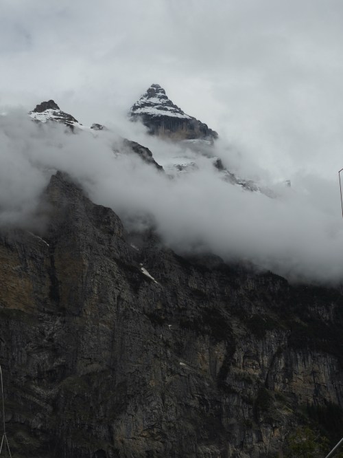 The fact the it was raining and overcast this morning didn't slow us down at all. We started the day with a great walk down the mountain a bit to the tiny village of Gimmelwald. The rain stopped and it looked like the sun was trying to peek out, so we hopped a couple of gondolas to the Schilthorn (10,000', give or take). It was mostly in the clouds, but there were some interesting photos to be had. It is also the location where the Bond film “On Her Majesty's Secret Service” (starring that oh-so-famous-Bond George Lazenby and the lovely Diana Rigg) was filmed, so it is a Bond-centric place. Whatever. The people watching was outstanding, however.