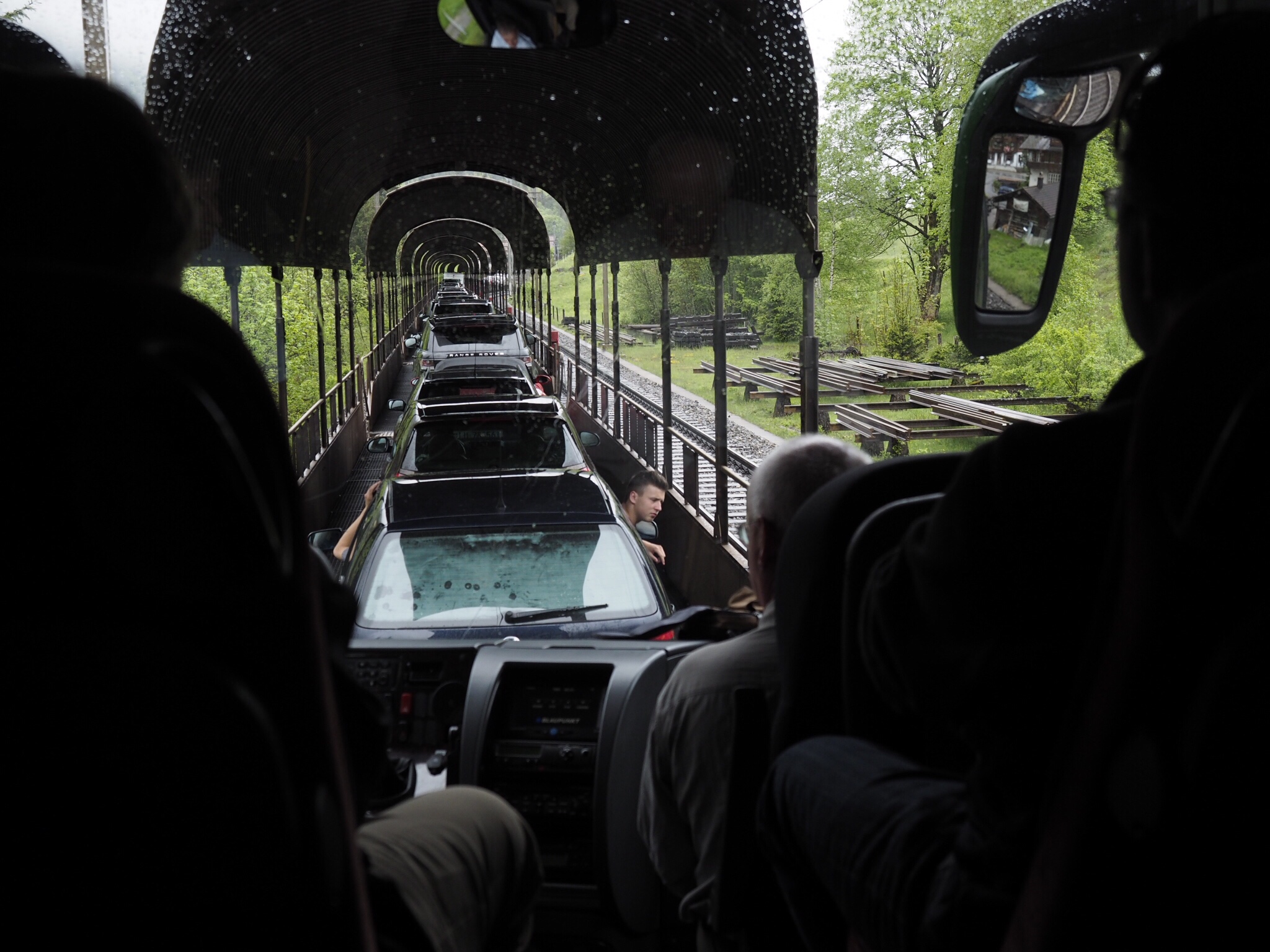 (BTW: yesterday on the way here, the bus was loaded onto a train — with us on it — that took it through a mountain. Saved us 1.5 hours on the road and was a very odd experience.)