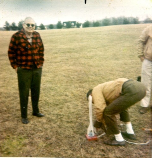 We went out several times to “launch” and the experience directly benefited my later career by training me in the acceptance of failure. Let’s just say that Rocket Science was not their strong point. The white rocket shown above was mine, and one of the few that launched successfully. BTW: that’s my dad on the left. The gentleman who is showing us his derriere is Mr. Morris. Mr. Morris had a little yellow two stage rocket that never did launch successfully. He ended up giving it to me in disgust. I never got it to go either.