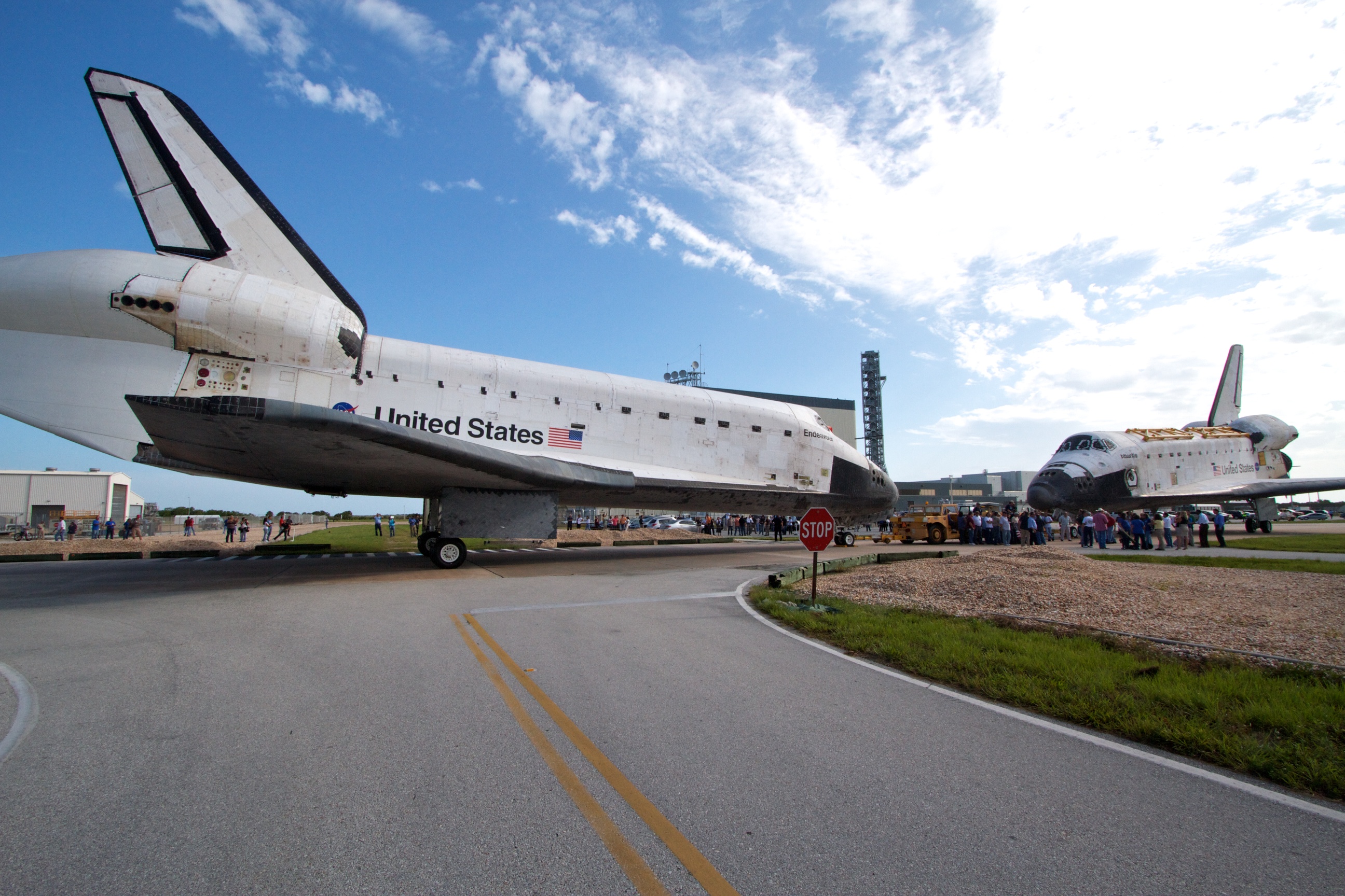 Allow me to divert from our trip report for a few moments to show y’all some photos from yet another in a long (too long) series of “lasts” that have been taking place here on the Space Coast over the past few years. On August 16th, two Orbiters came nose to nose for the last time. Endeavour was wheeled into the VAB to wait for her ride to her final resting place (Los Angeles) and Atlantis, which is staying here at the KSC Visitor Center, took her place in the OPF for final processing.