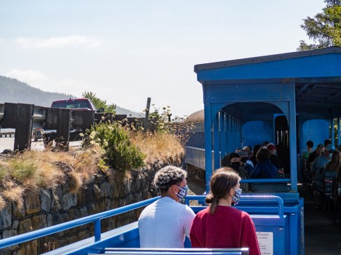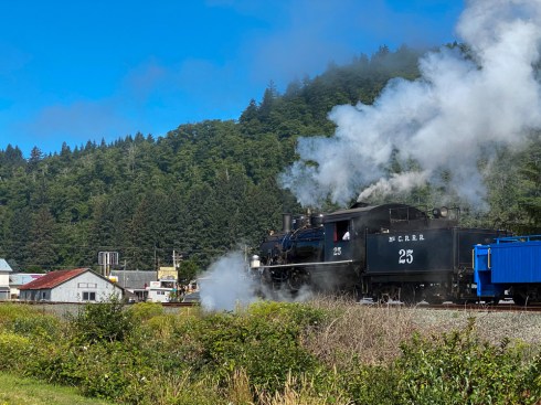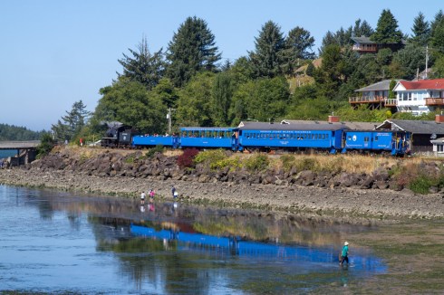 While staying here in Garibaldi, we have grown accustomed to hearing the train whistle of the local tourist line as it announces its departure from and, 90 minutes later, its return to the station just a short walk from the RV. The Oregon Coast Scenic Railroad runs three times a day on weekdays, four on the weekend. The weekend runs are pulled by a vintage steam engine which certainly looks and sounds the part of an old timey train. It only goes about 5 miles up the coast to Rockaway Beach and then comes back to Garibaldi after a 30 minute “layover.” One beautiful morning we took the first run. Sandwiched between Tillamook Bay and Rt 101, we enjoyed the scenery along the coast. We strongly recommend.