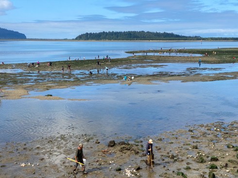 People clamming at low tide. Often there would be many dozens, entire families, out there. At high tide the pier would be full of people trapping crabs. Good eating. Garibaldi, OR 8/5/20