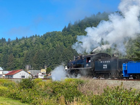 While staying here in Garibaldi, we have grown accustomed to hearing the train whistle of the local tourist line as it announces its departure from and, 90 minutes later, its return to the station just a short walk from the RV. The Oregon Coast Scenic Railroad runs three times a day on weekdays, four on the weekend. The weekend runs are pulled by a vintage steam engine which certainly looks and sounds the part of an old timey train. It only goes about 5 miles up the coast to Rockaway Beach and then comes back to Garibaldi after a 30 minute “layover.” One beautiful morning we took the first run. Sandwiched between Tillamook Bay and Rt 101, we enjoyed the scenery along the coast. We strongly recommend.